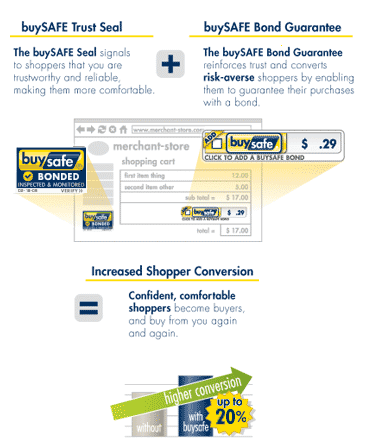 buySAFE provides the only explicit, third-party endorsement of a merchant's trustworthiness and reliability - backed by a bond guarantee.With buySAFE, online merchants can expect: